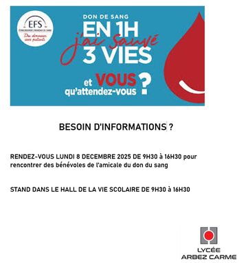 LYCEE ARBEZ CARME: STAND D'INFORMATION DON DU SANG LE 08 DECEMBRE HALL VIE SCOLAIRE